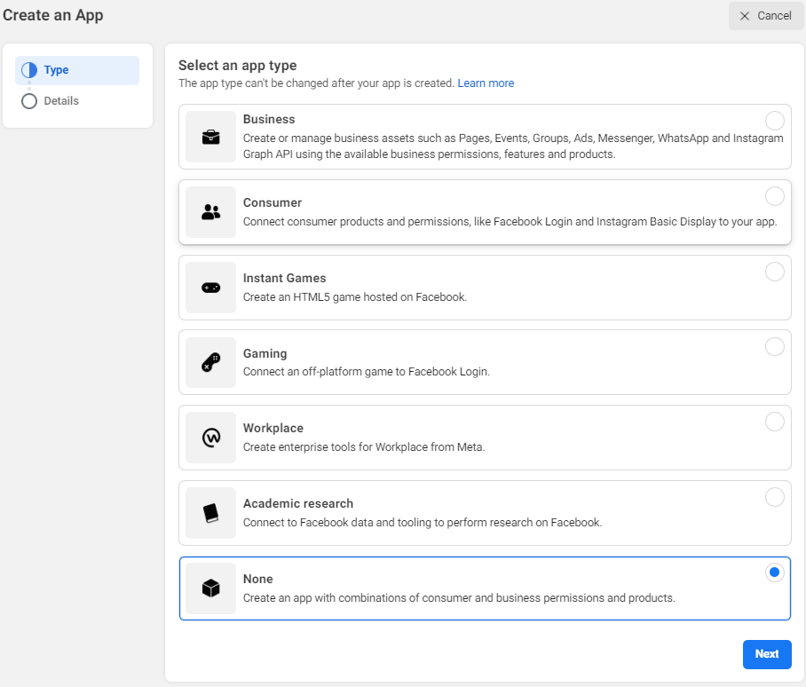 A page is displayed where the user should choose the app type.