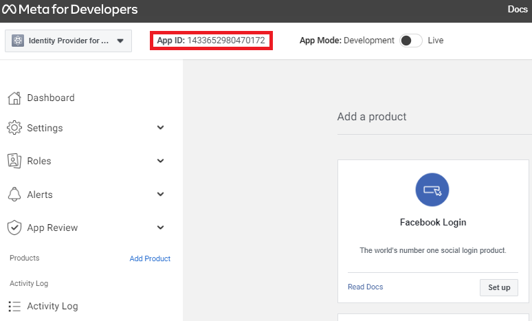On the Dashboard tab, in the Facebook login square click on the Set up button.