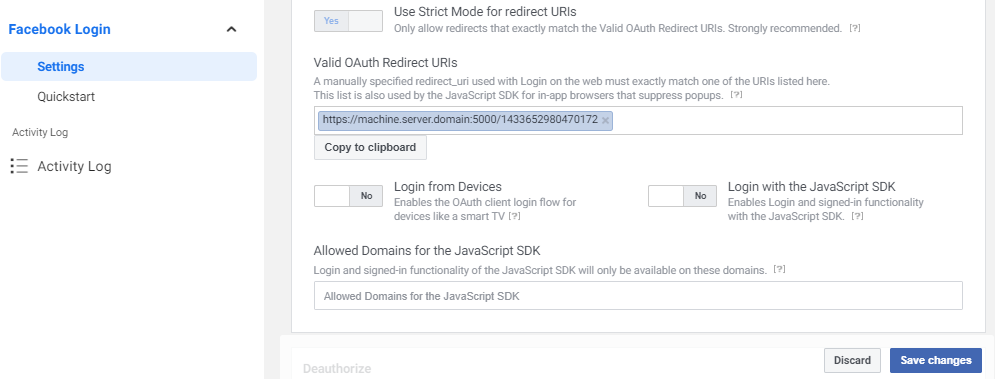 Go to Facebook Login select Settings and in the Valid OAuth Redirect URIs field enter the address where ATS Security Manager is installed appended with the Application Id and click on the Save changes button.
