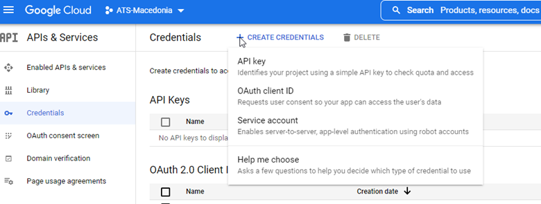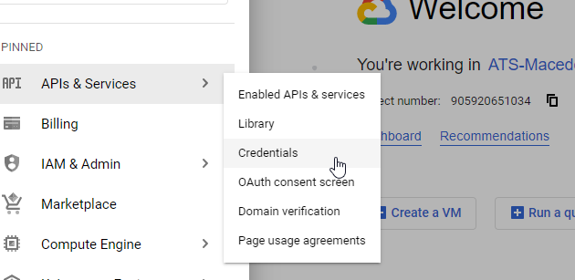 Click on the Google Cloud menu and choose API & Services followed by Credentials.