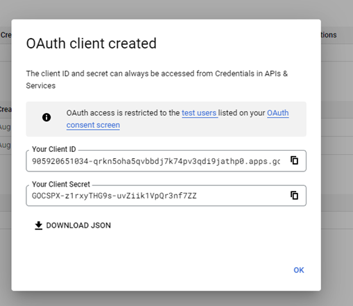 A window will pop-up saying that OAuth client is created. The user can see the Client ID and Client Secret.