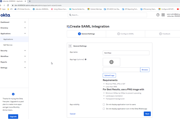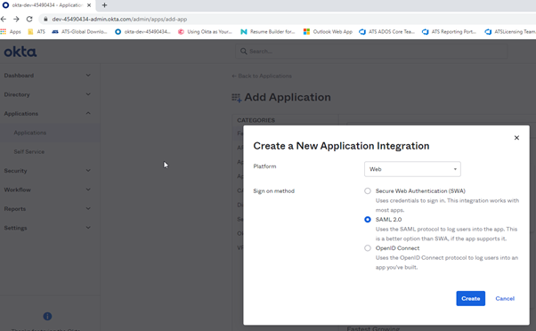 To use the SAML identity provider in ATS Security Manager first a SAML application is required to be created. For the purpose of this example, Okta will be used.
