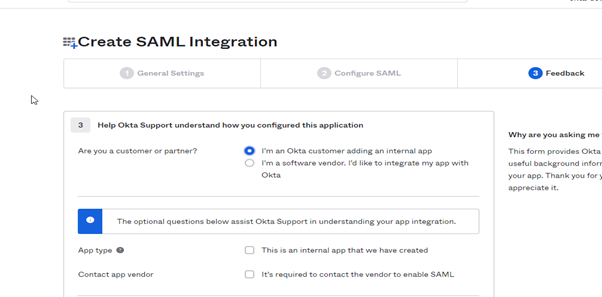 After the Configure SAML section specify that this is the internal app and click Finish.