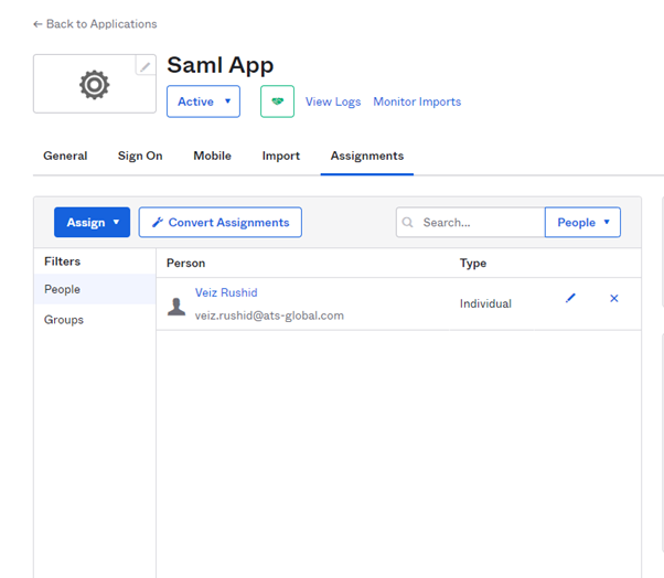 Following the successful configuration of the SAML application in Okta, users and groups can be assigned to the application in the Assignments section. The application can be only be used to assigned users or groups.