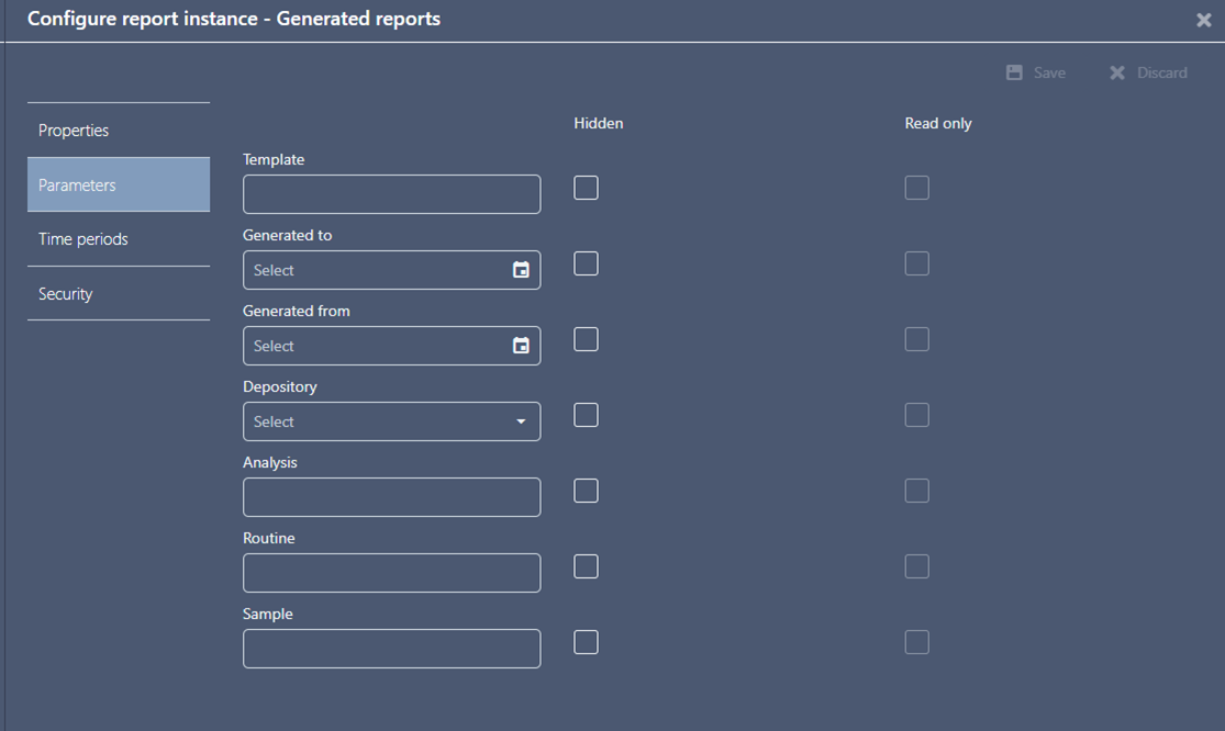 The Parameters tab becomes active. All available report parameters are loaded and any previously configured parameter values are shown. There is a hidden check-box for each parameter in the Parameters tab.