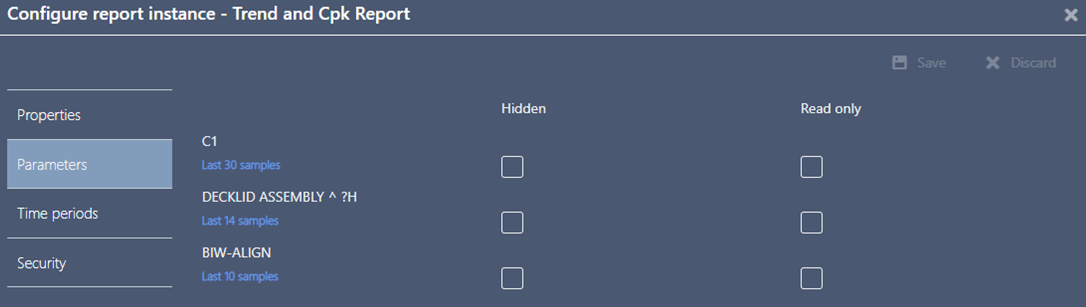 The Parameters tab becomes active. All available report parameters are loaded and any previously configured parameter values are shown. There is a read-only check-box for each parameter in the Parameters tab.