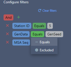 If there are filters available for the specific managed report the filter builder is shown. Users can choose filter names, a operator (Equals and Excluded) and single or multiple values depending of the type of the filter.