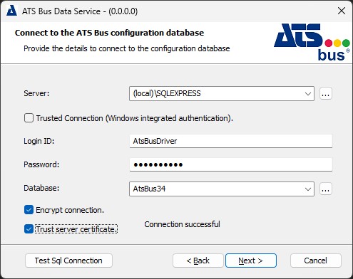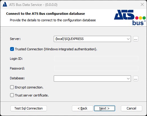 ATS Bus, ATS Security and ATS Licensing connection strings can be enriched with the Encrypt and TrustServerCertificate properties to connect successfully to SQL Server. Use these properties in the event of an SQL connection related error message.