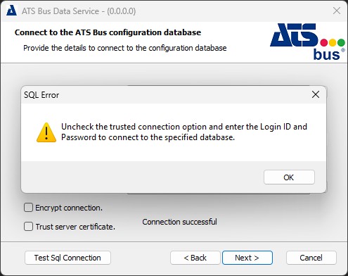 ATS Bus requires the SQL server instance to support SQL authentication.