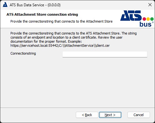 ATS Bus data service. The data service uses the certificate configured in the Kestrel section of the appsettings.json file. The installer selects it from the Personal folder of the local computer certificate store.