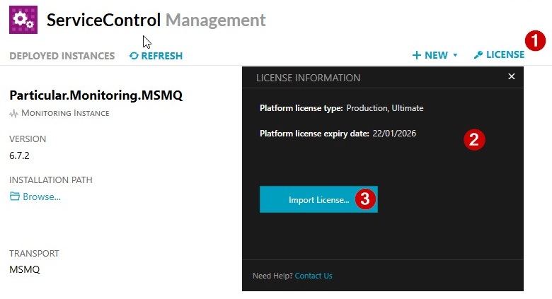 Open Service Control Management (Particular.ServiceControl-x.x.x.exe) and click the License button (1).
