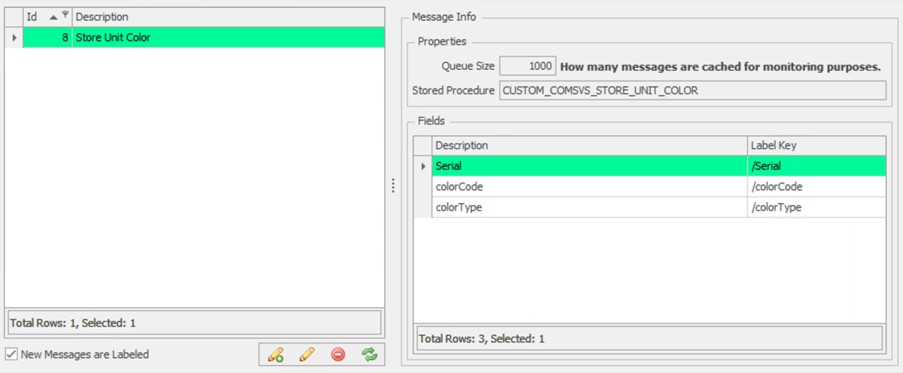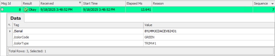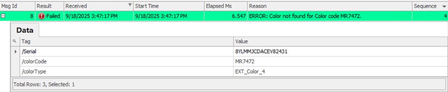 The stored procedure checks to see if the provided serial and color code to be used exists and if not, returns a custom error message that includes the serial number or color code provided to the stored procedure and sends it to the Comm Service screen in Cockpit.