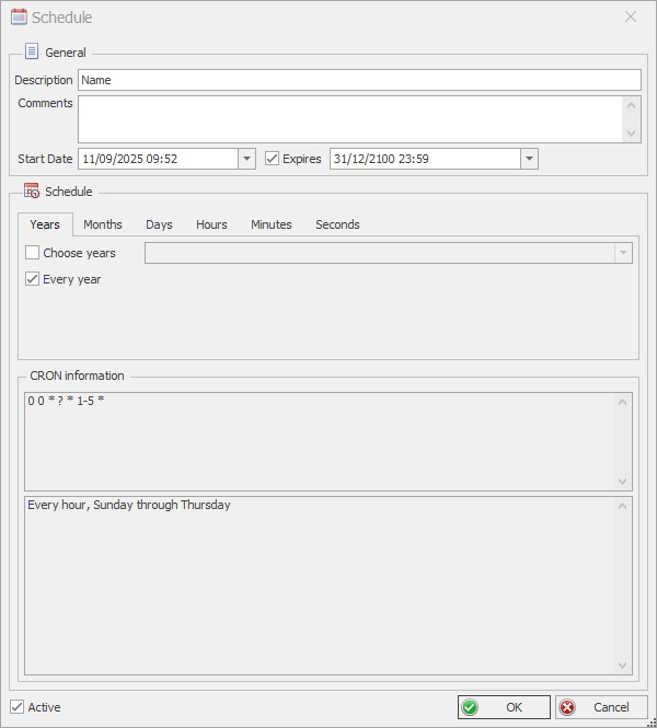 The schedule can be defined using the following tabs: Years, Months, Days, Hours, Minutes, Seconds.