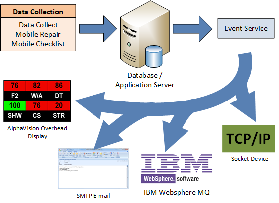 Event Service notifies designated plant employees of events as they occur on production lines. Such events can include recurring defects, a specific number of defects per number of units, or events that occur at a specific tracking point. When any of these events occur, notifications can be sent via e-mail, MQ Series device, socket device or overhead display.