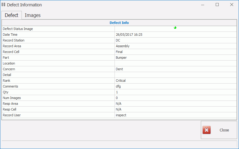 Click to close the Defect Info screen. |