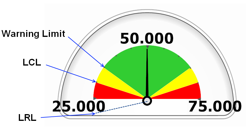 There are two types of indicator that can be used. These indicate whether the number is within control limits or not. The lower limits are shown on the left of the control below. The upper limits are the same on the other side: